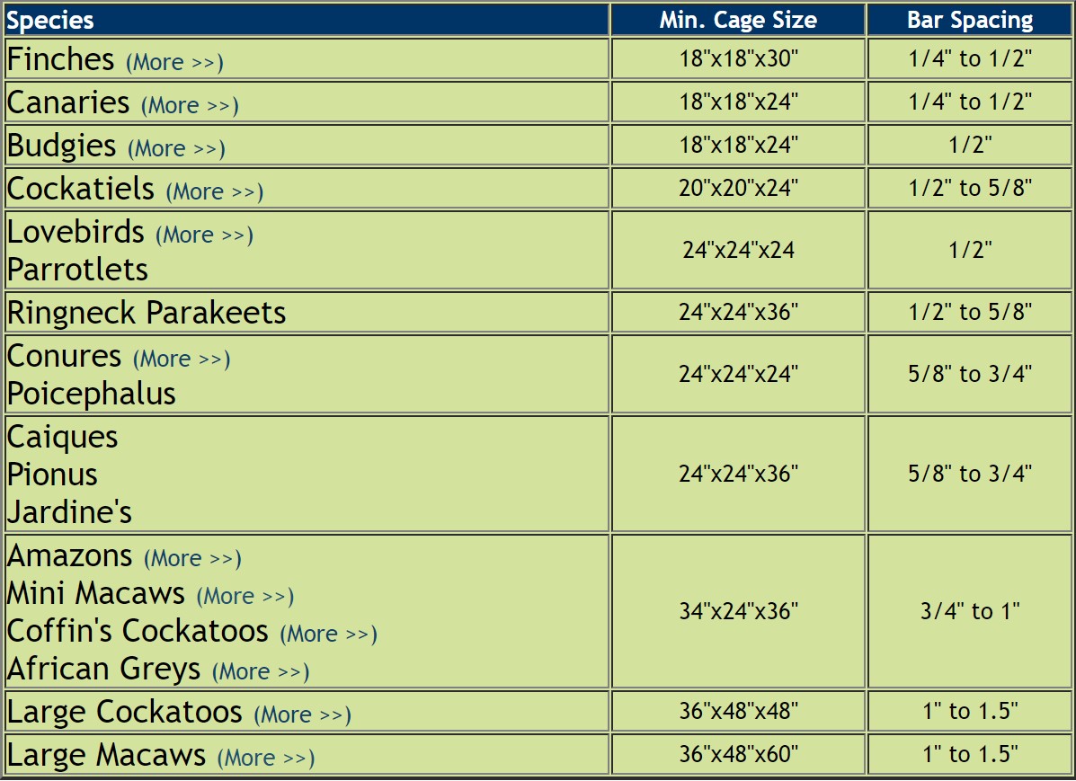 We first recommend you purchase the largest cage you can afford because all the toys and accessories that are required will take up a lot of space. 1 or 2 toys with dowel perches is not okay (see picture above a proper cage set-up)! Your bird needs at least 3 to 4 toys and perches with different textures and widths. Therefore, it is a common mistake for bird owners to buy cages that end up being too small. To help you out, we provided a helpful chart that shows what type of cage will best fit your bird.